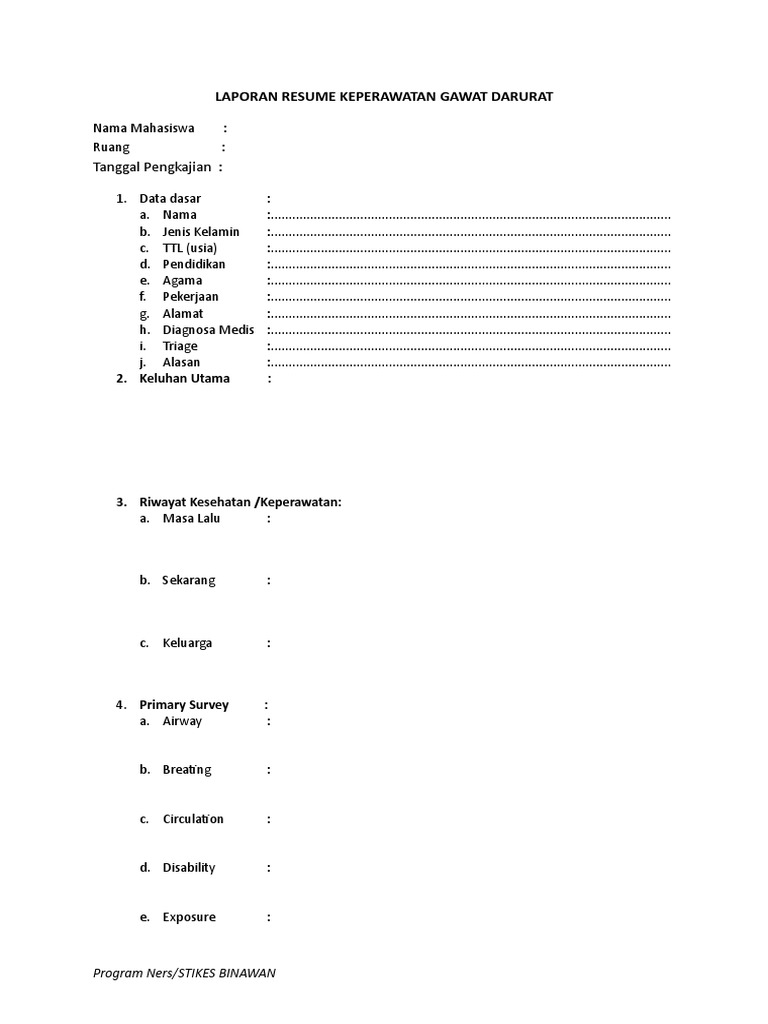 Keperawatan gawat darurat klien resume 6 nama mahasiswa npm. Nama psien umur diagnosa medis. Pelayanan keperawatan yang diberikan kepada individu dan keluarga/orang terdekat yang diperkirakan atau sedang mengalami keadaan yang mengancam kehidupan. Keperawatan gawat darurat (emergency and critical care nursing). M diperiksa, bp 120/80 mmhg, hr 88 x/menit dan rr 20 x/menit. Di unit gawat darurat, dua pasien akibat kecelakaan datang secara bersamaan. Resume adalah cara efektif untuk melakukannya. Akhirnya perawat dan tim menerima keputusan pasien. Demikianlah contoh laporan resume askep gadar/asuhan keperawatan gawat darurat semoga bisa menjadi masukan dalam pembuatan laporan keperawatan. Please fill this form, we will try to respond as soon as possible. Materi keperawatan gawat darurat : Kamu bisa menerapkannya untuk buku, jurnal dan beberapa portal media lain. Namun ugd dan klinik kedaruratan sering di gunakan untuk masalah yang tidak urgen.